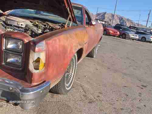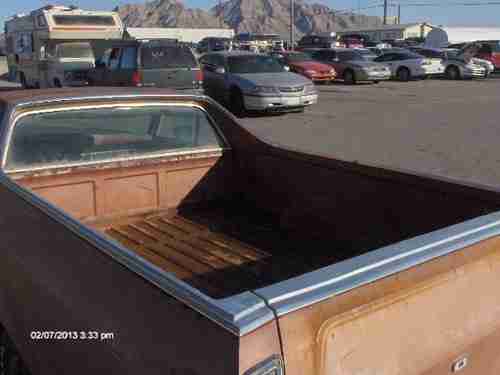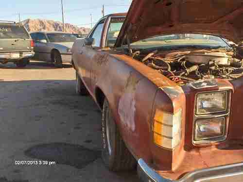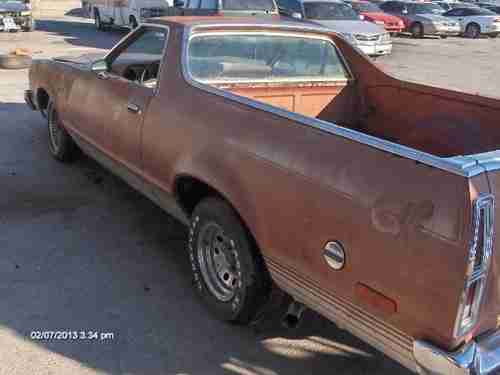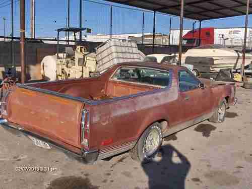 1978 Ford Ranchero with a V8 motor we think is a 351 Cleveland. You can look at the photo of the motor. We have a clean title in our possession. This car has been sitting for the last several years in a guy's yard here in Las Vegas. We got the motor to start and run and the car to move. We cannot guarantee it in any way shape or form. The odometer listed is the five digits showing on the speedometer. We do not know what the actual milage of the car is since its only five digits. We suspect any one who bought this would want to go through it as part of the restoration process. The glass seems fairly intact except the windshield does have a crack in it. -see the photo- The rear window looks like it was "gunked in" with some sort of glue.-see the photo- When we got the car it had a bunch of junk in the bed. After we cleaned it out, it left a lot of surface rust, but there are no cancer holes we can spot. In fact most of the sheet metal seems to be pretty straight and cancer free. We tried to take photos of the side to show what we believe is good shape. Nose seems to be complete and pretty good condition. Most of the chrome looks ok also. Rear Bumper has been whacked and is dented. We took a photo of the undercarriage to show the condition the frame and undercarriage is in. The frame looks straight and not eaten with rust. The car came with factory air but the compressor is missing. The headliner is dried out and sagging where the stiches are. Dash is dried and cracked. Seats are dry rotted from sitting in the sun, carpet also. We will be happy to show the car to anyone who is in Las Vegas from 8-5 Mon-Fri. It is in our yard at 2810 N Nellis Blvd. Please call 702-354-6723 to make other arrangements to see the car. Car is sold as is where is. Shipping is the buyer's responsibility. We will help load this car onto a transport truck.