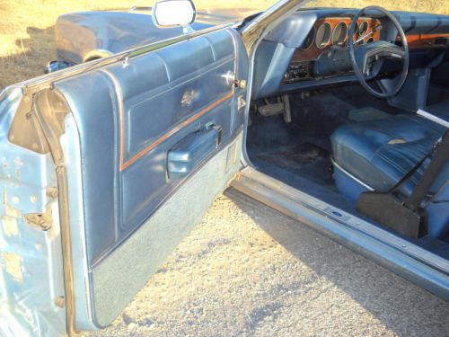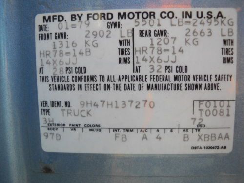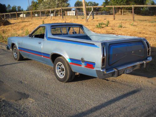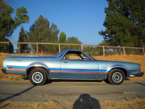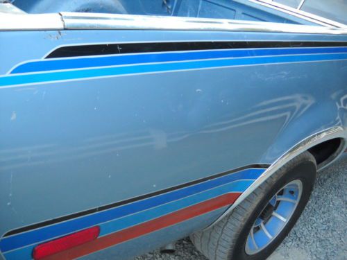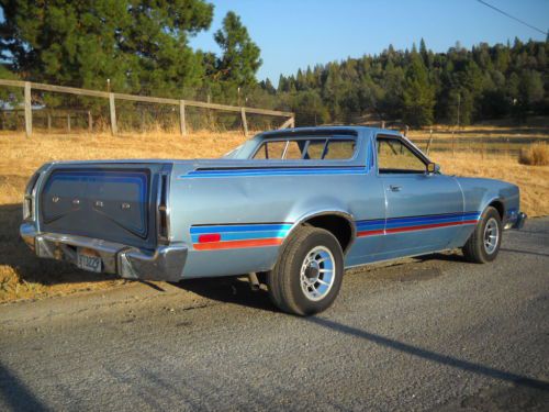 Up for auction is a clean rust free 1979 Ford Ranchero Brougham, it is a California truck, with new carpet, and custom 70's paint/sunroof.... Check out those wheels! This was the last of the mid size Ford vehicles with a full frame, and the last year for the Ranchero. This one has the full instramentaion, like the GT models. All the gauges work, even the clock ! The tilt column is in good condition, and the cruise works! The cornering lamps and other lights also work. The engine is a stock 351 M, and has the FMX transmission. The rear axle is the HD ford 9 inch unit. This truck has had the following recently; master cylinder, rebuilt front end including upper control arm ball joints and bushings, new shocks, ( HD overload rears) new tie rods, power sterring box and hoses,new radiator, trans service, and new premium carpet professionally installed. This ranchero is currently California registered, and has recently passed the very tough test. It has a clear title. The sunroof is a twin type, and has not leaked. It has a carpet bed mat that velcros and snaps in.I have a set of replacement bed trim parts and clips that go with the truck. There was NO rust or corrosion on the floor when I had the carpet replaced. This Ranchero has 2 dents and a few dings,with several paint chips . It also has faded paint on the Left had Quarter. I am sure it has been repainted,but, is the original RARE color. This is the same as the 1978 Lincoln Mark V / Ford Thunderbird Diamond Jubilee color..... All in all, a nice example of the last of the Rancheros......Feel free to ask all questions before bidding, sold "AS IS" will help your shipper. East coast shipping to the NY area is about $1200.00 as a ball park. I reserve the right to end this auction at any time as it is advertised locally. Sold with NO RESERVE! Call for questions! 530-620-3665
