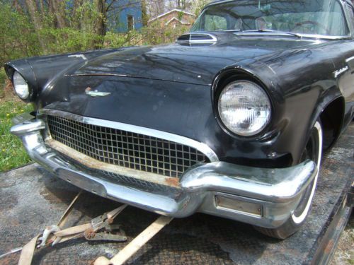 One family owned until now, 1957 T Bird. Classic "ran and drove fine when parked" as per son's description. Last ran about 9 years ago. Father passed away about then, I bought it from his widow. Car was stored in a heated garage but is never the less weathered. Very restorable though. Might be fun for some to just get it going and drive as is, the interior is not really that bad. 42,863 original miles Body has rust in quarters and rockers. Driver side rocker is toast, passenger side less so. Floors and trunk are solid with relatively nice original paint. Frame is solid. Rest of the body is pretty clean. Passenger front fender needs a bit of massaging due to a hit on the front corner, easy to straighten with a bit of talent. All shut lines on the doors, hood and trunk are good. Trim is all there, bumpers not beat up. Chrome is all weathered but not seriously rusty. Straight forward replate if wanted. Glass is good Headliner pretty nice with one about 1 inch tear. See pic Convertible frame included, original top is shot. I gave the interior a quick wipe down and vacuum. For a restored car it would never do but I could live with it in a driver. See the pics. I believe it's all original. The "turned metal" trim is still pretty nice. Gauges look good, finish all in all still not bad for being all original. Some heater components appear to be missing, core is there, and I do have some loose parts included with the car, including new tail light lenses. The old add on tach pictured is not included in this sale, a buddy of mine begged me for it. Car has a factory tach anyways. Engine was/is not stuck. I was able to nudge it by hand using the fan blade. I then pulled the plugs, shot in some oil, and cranked it over a bit. Put plugs back in, cranked it a bit. Obviously has compression, but alas no spark. I didn't want to put fuel into the possibly dirty tank anyways, and didn't make anymore effort to fire it up. The headlights work, turn lights work, heater fan works (2 speeds) and amazingly, to me at least, the radio works. Wipers are not. Car came with new tail light lenses in boxes. See pic. Brakes are not working, car rolls fine. So, there it is, the proverbial Diamond in the Rough! Personal inspection is welcome, call me, Doug 937 231 0193 Thanks for looking!
