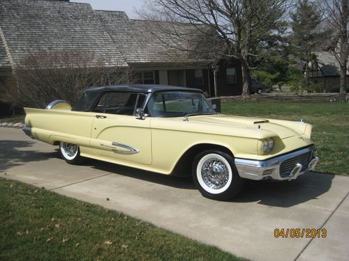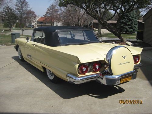 Up for auction a stunning 3 Owner 59,069 mile 1959 Ford Thunderbird Convertible. It was purchased new from Jack Thrasher Ford Sales, Inc. on September 2, 1959. It's finished in Casino Cream with black leather with white piping and stitching and a black power convertible top. It is equipped with a 352 v-8, Cruse-o-matic transmission, magicaire heater, console radio, windshield washers, seatbelts, back up lights, 70 amp battery, dual outside mirrors with driver remote, power steering, brakes and factory undercoating. This car is rust and filler free and has had only one very nice repaint since new. The convertible power top is like new and work perfectly. The chrome and stainless are original and very nice. The glass is original except for the windshield. It has new BF Goodrich Silvertone 8.00-14 with wide whitewalls and new Kelsey Hayes real wire wheels. The car sat for many years so the transmission, carburator have been rebuilt, new radiator, master cylinder, gas tank, and brakes. It runs and drives great. I have original paperwork (not copies) as follows: window sticker, hand written and typed bill of sale, warranty info, owner's manuel, 2 Indiana registration cards. It has a small dent on the right quarter panel about the size of a fifty cent pcs and needs the heater core replaced. If you have any questions send me an email of call Mark @217-202-4440.
