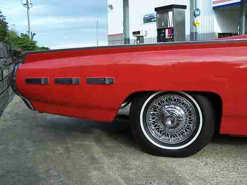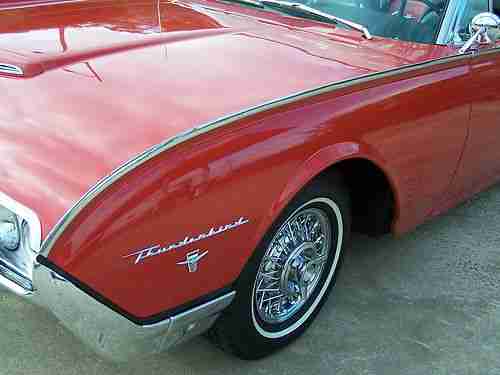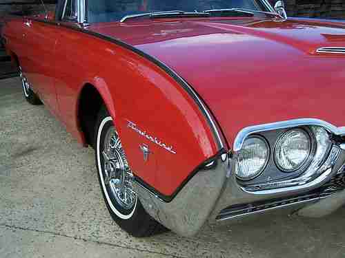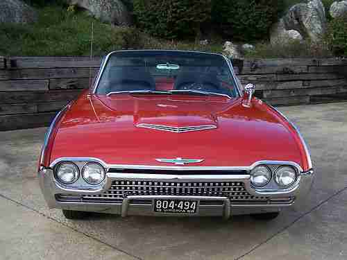 Up for sale is by 1962 thunderbird sports roadster. I have owned the car since 2006. It came for CO but was orginialy sold in CA.I have docomentation from 1988 when the car was baught by Carl Dane of Nascar Fame. You can look him up on line. At that time he had the car restored including new paint, chrome,engine and transmission gone over. Sometime before that a set of orginial Ford 3x2 setup was put one the car. Carbs are dated 1962 and are correct in every detail including the right crank case breather tubes and air cleaner. The gas line is rubber from the fuel pump to carbs however. An orginial autolite carb and 4lb intake and air cleaner is included in the sale if one chooses to put in on. The 3x2 runs great. In 1988 Mr. Dane sold the car to his nefew. He had a brand new top put on and a new top motor and raditor core instaled. I have detailed records that were included with the sale of the car to me at this point. Since I have had the car I have done many inprovements to it. New: exhaust system(front to rear), brake pads and cylinders, water pump, fuel pump, steering box. all alum.trim and switches replaced, new wire wheels(the 5 orginials are included and are not really bad, slightly dull). The front seat covers looked to have been replaced (nice). The rear ones look to be the orginials and are nice also. The interior trim has been polished and looks new. Dash pad looks new and was probably replaced with a NOS ford part in 1988. Car has brand new carpet. Door panel are orginial along with the sun visors and are GREAT. Chrome on dash including all knobs is extra nice. Horn button has been replated, ring is orginal and nice. Steering wheel is like new with no crackes or scratches.Rotanda Tach was added by me and works find. Cup is like new. There are two radios that come with the car. The orginial AM and the aftermarket AM/FM that I put in. Both work find. No extra holes cut anywhere. Same with clock, orginial and the new quartz. All guages and controls work as they should.The AC has not worked since I had the car but all factory parts are present.I do not have the skill to work on this but I do know the clutch on the compressor does work.BODY: This is the most amazing thing about this car. I can not find any rust at all on this car,top or bottom. I went over it with a magnet when I bought the car and couldn't find any body filler anywhere Panels are stright and alinment is right on. I would say paint is 9 out of ten. There are no dings or dents Grill has been polished.The out side stainless trin has not been polishe(did not know now to take off) and there is a small dimple in two of the six pieces. Other car trim (emblems, beezels,door handles, mirror, ect are like new. Rubber trim is excellent. Rear weights are installed in trunk but the front ones are in boxes and not installed. Probably left off when front bumper was replated. TOP: Top is excellent with no rips or tears.Window is clear with no scratches.The darn tap on window is broken but should not be hard to fix.Top worked find when I got the car but the trunk lid does come up a little slow.Goes down find. Rest of top componts work find. All switches and relays work as they should.SUPENSION:New rebuilt of front and new springs on back with all new bushings. Shocks looked good(with no leaks) and were not replaced. New radial tires is 2007 including spare. SUMMARY:This is a beauitful sports roadster(a early one and a real one) I have the docmentation. With a no rust body and has not been messed with and butched up in any way. If you like the style of the 1962 and want a good car This is IT! It has not been on ebay before and is not in the tbird registry. I have done my best to describe this car but I may have missed some issues you may be concerned about so please feel free to email with any questions. And thank you for taking time to look at my car.