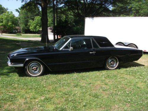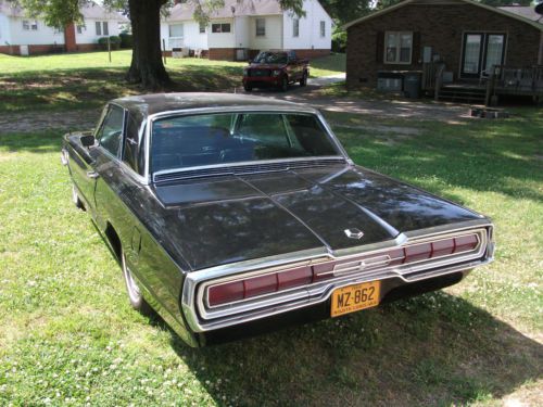 1966 Ford Thunderbird. Nice black on black. 390 cu in engine. Freshly rebuilt 3 speed automatic transmission. All original interior still looks good and would be considered driver quality. Paint is only a few years old, not a wet sanded and buffed clear coat finish, but is of nice driver quality as well. This is not a show car but a very nice driver that will need a few items taken care of to be enjoyed to its fullest. I can find no rust in this car at all. Floors, Trunk, Doors, and the rest of the body all very solid. All the tires are in great shape, with the spare being new. The trunk has tight weave black carpet glued in place, giving the trunk a finished look. Has new window whisker strips installed. Rear fender skirts are in the trunk. Now for the negatives ; Drivers window stopped working, and I have not checked to see if it is the switch or the motor. Has two small mufflers on the duel exhaust that are a little to loud for my liking. AC works, but pump is a bit noisy. Car pulls to one side when driving, and will need power steering adjusted. I do not know if the millage is correct or is over one hundred thousand miles. Most of the exterior chrome is in need of rechrome if you want it show quality. That's it, a great cruise night driver that can be worked on while you enjoy it. Pease ask questions before bidding I want you to be happy with your purchase.