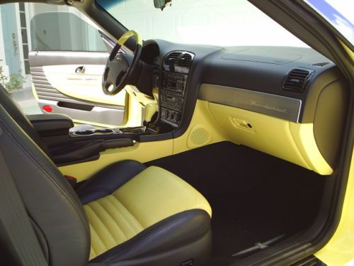 2002 PREMIUM FORD "RETRO" T-BIRD IN INSPIRATION YELLOW ONLY 34,720 mls! This Thunderbird is LOADED! Has double overhead cam, 32 valve V-8, aluminum block & heads, 240 cubic inch 3.9 liter, sequential electronic multiport electronic fuel injection, 5 speed automatic transmission, equipped with optional traction control, stainless dual exhaust with chrome tips & K&N style air intake system. Special 2002 only color- INSPIRATION YELLOW with FULL accent interior (yellow inserts-seat, dash, doors, steering wheel, shift knob). Comes with factory matching hardtop complete with stand & cover, electric operated soft top with glass rear window, chrome alloy wheels, & parking lamps.ONE OF ONLY 1,850 PRODUCED THUS EQUIPPED! High performance tires-Yokohama S drive XL series, 235/55R17, (one size taller & wider than stock all season radials). Over $3000 in extras including; tail light bezels, matching headlight visors, chrome hood scoop bezel, chrome fender trim, top protection trim, top door trim, custom soft top boot cover, custom made one of a kind low profile headrests, V8 emblems, chrome doorsills, true black carbon fiber dash kit, rear deck ,at, trunk mats, front floor mats, custom tinted windows and installed battery maintainer. ** ALSO comes complete with original window sticker, all dealer documentation, sales brochure and all OEM extra parts. A hard top removable hoist is negotiable.** This "RETRO BIRD" is the most sought after color combo oh the 4th year run. If it is a yellow '02 T-bird you're after than you won't find a better equipped, cleaner, and well maintained vehicle regardless! PLEASE e-mail with any questions or additional pictures needed! |