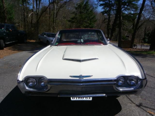 Classic 2 door Ford Thunderbird Hardtop. Powered by a 390 CI V-8 engine with automatic transmission. Has power steering and brakes. Professionally restored. Great looking throughout and finished in an optional two tone paint scheme. Many new parts (too numerous to list) by three caring owners over the years. A real headturner, show winner and the first year of the bullet birds. A true rust free car. Car is as good as it looks. Priced way below market and replacement cost. If you are looking to own one of the most beautiful of the Thunderbird models, then this is the car for you. I also reserve the right to end this auction early as I have the car for sale locally as well. ! FEATURES INCLUDE: ~Original Built card Manual ~Popular 390 Cu. In. 300 HP Z code engine ~3.0 geared rear end ~Rebuilt 4 bbl carb ~Replaced AM/FM radio cassette (the original am radio is also included) ~Total brake overhaul including brake booster ~31,900 original miles (undocumented) ~Original chrome work ~some wear and small rips in red interior ~Dash board has no defects ~Slide away steering in perfect working condition ~Thunderbird Floor mats in front and rear ~Rare Thunderbird wire wheels ~New Michelin Tires ~New rubber bumper gaskets ~New gas tank with gauge working properly ~Added matching red seat belts ~Floor pans and undercarriage solid with no rust ~Shocks and front end new ~Professionally rebuilt cruise-o-matic; transmission and tourqe converter I am the 4th owner of this T-Bird and have tried to keep most parts original. Paint has one repaint, which is in great condition.