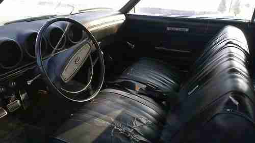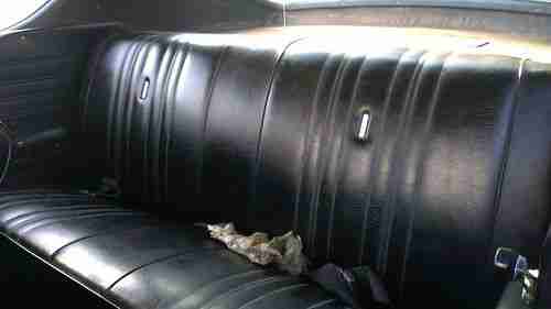 The interior is complete, back seats are not torn, rear package tray ok, needs headliner, all door panels are ok except the drivers which has a small tear but the door lock knob, carpet worn, dash pad is straight and free of cracks. Front bench is torn but cushion is not exposed. All seat belts are on car and back are still in plastic.