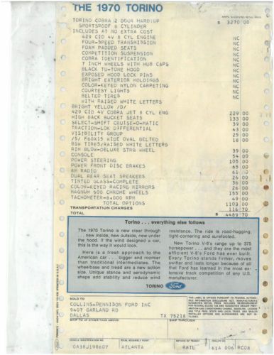 Up for sale is an excellent 1970 Ford Cobra Torino. This highly optioned car includes features like 429CJ engine, shaker hood scoop, Cobra accessory package, power steering, power brakes, rim blo steering wheel, bucket seats, auto trans, dual rear seat speakers, and much more. this car also includes its original window sticker and build sheet. The body was stripped and repainted the original paint scheme and colors. The original engine was completely rebuilt, blueprinted and balanced, and the original C6 transmission was also rebuilt. Reciepts are available. There are a few non original items, like rear disc brakes, wheels, Mallory distributor, Hooker Headers and Global West front suspension, but other than that, this car is very original and complete. The interior is in great shape,and has a near perfect, original dash pad. This is an extremely nice, well docuemented and original muscle car.
