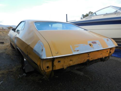 This is a 1972 Gran Torino Sport laser stripe Q code car. The car is offered with NO ENGINE. Complete car with exception of a few parts. There are some tiny rust holes in the trunk pan and the rear quarter panels, both doors will need some body work. The c6 trans looks to be rebuilt but not sure of that. Trans mount and drive line has been cleaned and painted. The parts that I see not with the car is the complete front grill assembly,front seat belts. I believe the passenger seat is not the correct seat. Wheel well molding missing on one side and the other side pretty banged up. I have title in hand and the car is sold AS IS. What you see in pictures is what you get. Look at pictures and ask question if you need to.