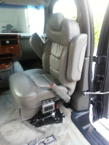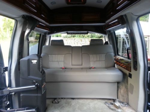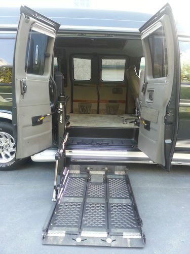 2003 GMC Savana 1500 wheelchair accessible van. 74,621 miles. Chariot Custom Van. Tires in great shape. Driver and passenger rear side doors (standard height). 5.3L V8 with Automatic transmission, A/C, aftermarket polished aluminum wheels, running boards, power windows and doors locks, leather seats, carpet, wood trimmed interior, remote start, keyless entry, alarm, new AM/FM/XM-Sirius/DVD/CD/Bluetooth/iPod/Pandora/USB radio with wireless remote, new speakers, single 8" subwoofer, backup camera, navigation, rear cabinets, power inverter, rear heat and air, fold-down rear seat.. The back has a TV, DVD player and VCR with a separate radio and headphones. Modifications for wheelchair include: Braun Vangater lift with dash controls, controls on the lift, magnetic outer controls and wireless remote, LED load lights, tie down straps in center of van, transfer passenger seat, and automatic power doors on passenger side. Doors and lift are all controlled with the included remote and other controllers. There is a dent in the rear bumper but it is still good for use and the passenger running was notched to accommodate for the lift. Included with the van is an 8 foot foldable portable ramp that fits in the back. I used it for getting inside places that had no ramp. I am the second owner but this van has never seen any hard miles. Any questions/offers regarding this vehicle please feel free to email through eBay. I will try to answer anything asked in a timely manner.