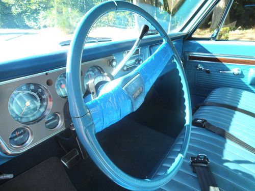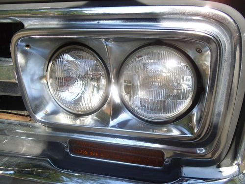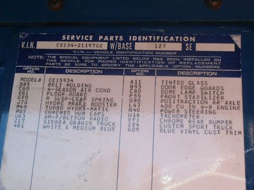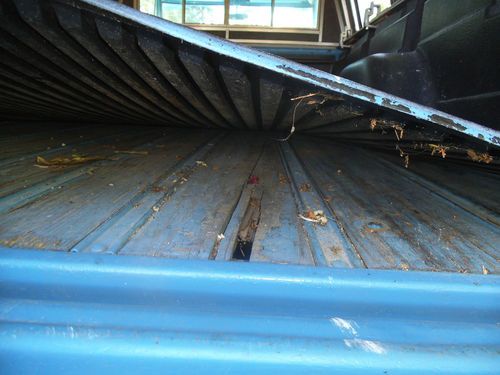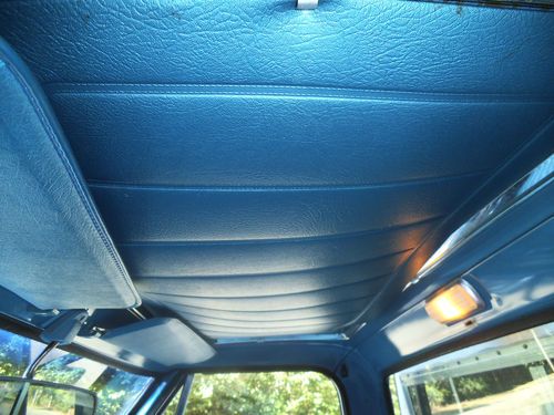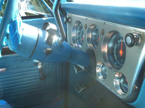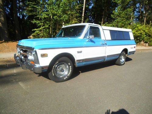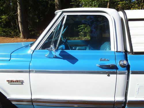 This GMC truck was bought by my dad in 1971-he has been the only owner--He owned his own gas station for 37 years so he changed oil every 2000 miles and transmission oil every 15,000 miles.Never had any body work,always kept in garage or under carport,the chrome is near perfect all over the truck,chrome on headliner is very good,98% rust free. At 100,000 miles had a timing chain and lifters...125,000 miles ball joints on the front end.....135,000 miles complete valve job--new valves..good battery...165,000 miles new radiator--not stock....168,000 miles new calipers, Hoses and rotors are very good....169,000 miles a new alternator voltage regulator, belts are 2 to 3 years old....Coil front springs so rides smooth like a car*** Now if you want to show truck this one --on the floor of the drivers side as you can see in the pictures has worn spots,,if you want the air conditioning to work you will need to get compressor and hoses & fix air arm in dash control & put heater valve in hose under hood The original steering wheel could be replaced & the drivers side of the blue seat has been taped as you can see, the rest of the upholstery is in super shape, also the headliner is very nice ...Has the original wood slates on the truck bed under the black liner Also there are 2 extra gasoline tanks that were last used 20 years ago on each side of the truck....The truck is running great and is beautiful!!!!! Lots of chrome on this 1971 GMC Right now has 169,603 miles. Have original title also.