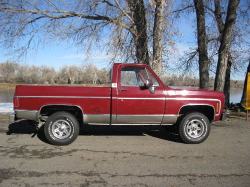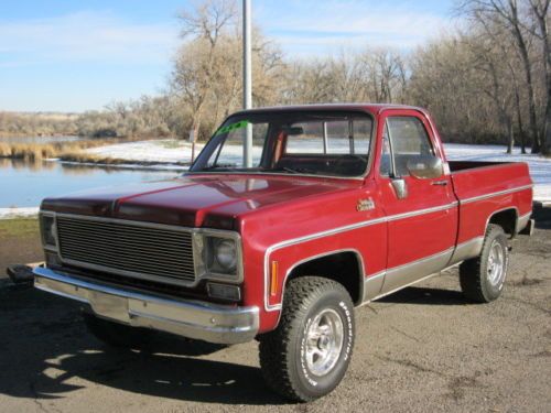 Very nice 1978 GMC Sierra Classic 1500, Factory A/C (everything is there just needs to be went through to see if it works), Cruise Control, it is a 4x4 with locking hubs, Short box, 350ci engine and automatic transmission, Red and Silver paint that looks really sharp, Red interior with a roof liner, Factory radio that works. The odometer reads 03185. but that could be anywhere from 103185 on up (with how nice the pickup is I doubt that it is over 103185). Very clean pickup. What you see is what you get, the pictures speak volumes of this pickup. Has aftermarket wheels on it that stand out on this pickup, the tires are in great shape. If you want anymore pictures or information call Donavon or Frank at the Car Factory, 406-896-9833, or Donavon at 701-570-2466, or Frank at 406-670-2357.