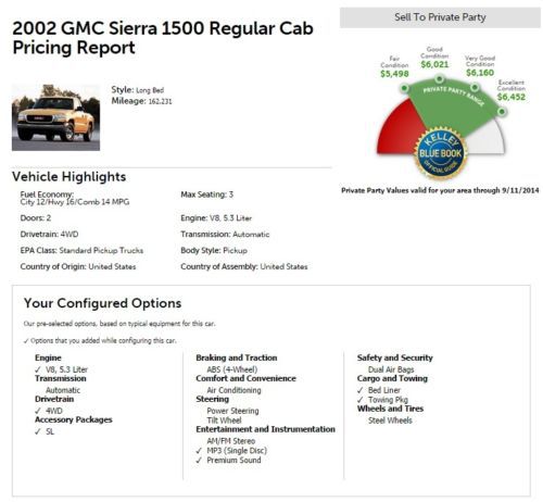 The GMC has been my work truck for the past year, It has done well for me, It does have some dents, scratches, rust, and is being sold "as is". The good news is the tool box in the back comes with the truck ( tools not included). There are no known mechanical issues, it starts up and drives like the day I got it. The tires are brand new less than 500 miles on them, they are hankook a/t 265/75 r16. In the photos it will show the Kbb values in fair condition is over 5,000$. If you have any questions or would like more pictures just shoot me a message, Happy bidding.