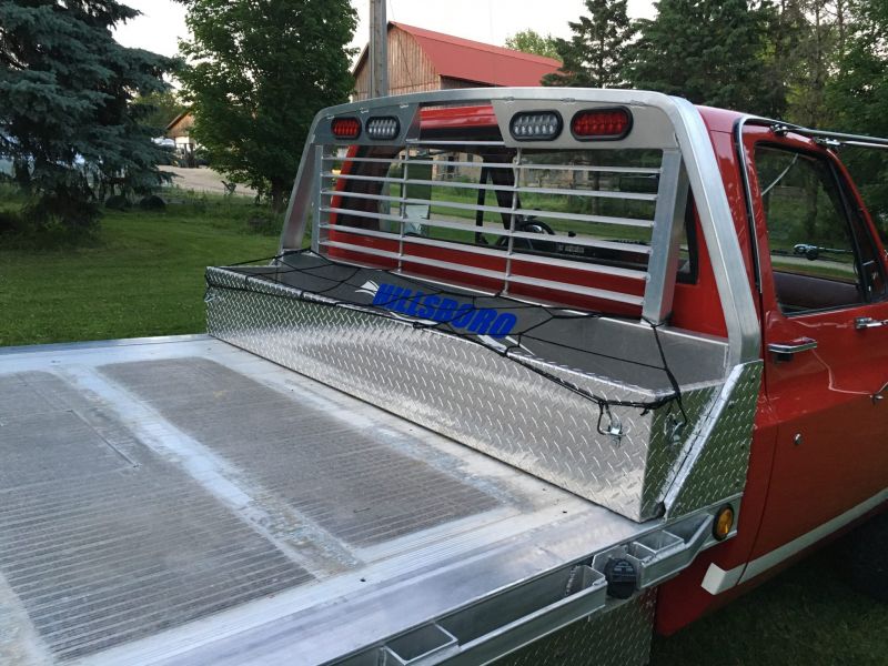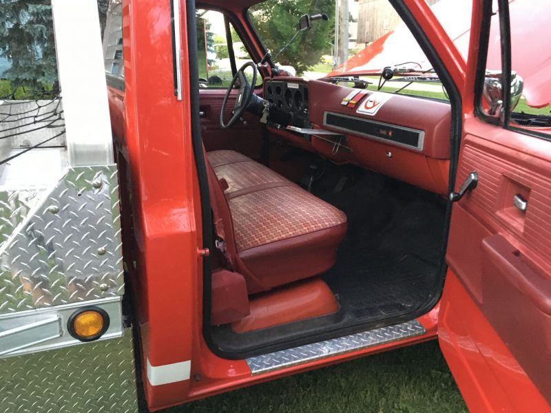 This 1979 GMC K3500 Sierra is a one-ton four-wheel-drive pickup that was finished in red over patterned red vinyl and powered by a replacement 396ci V8 paired with a three-speed automatic transmission and a two-speed transfer case. Equipment includes a Holley carburetor, an aftermarket intake manifold and headers, an aluminum flatbed, storage bins, towing mirrors, a winch, and spotlights.