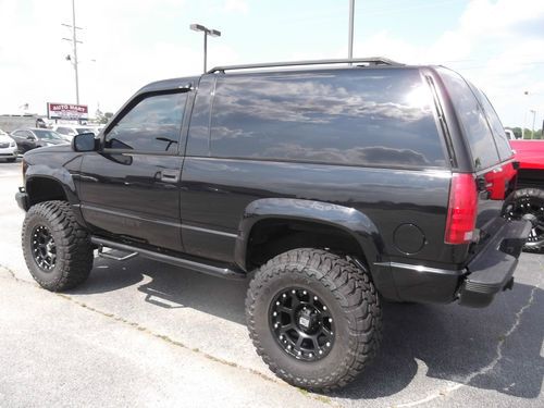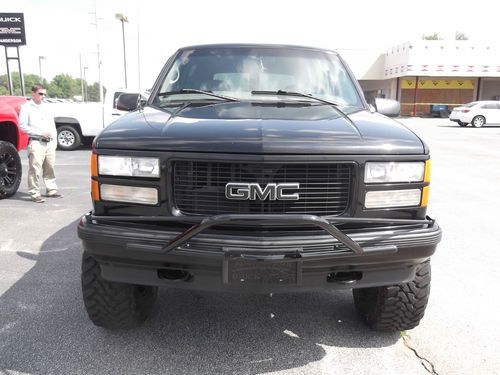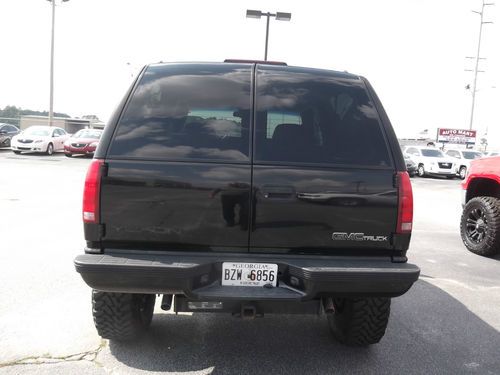 Super rare 1997 2 Door Yukon GT 4WD. I am selling my daily drive due to the fact my baby girl is getting too big to load and unload. I am the third ownwer of this vehicle and have already started the modifications to make this a show stopper. List includes new Rough Country 4 inch suspension lift, New 35x12.50x17 Toyo Open Country Mt tires mounted on new XD Revolver wheels(tires have less than 1500 miles), new heavy duty radiator and sterring gear box. Also upgraded Alpine Cd player with Blue Tooth hands free mic. New Alpine 6.5 inch door speakers with tweeters and new JL Audio 12 inch powered sub. I also have an extra new pair of Alpine 6.5 inch speakers with tweeters in box. I have installed a new set of N-Fab step bars and brand new Flo Master Dual Exhaust. The front has a new Baja Challenger light bar with new headlight lens with new HID Bulbs. Interior has Weather Tech floor mats in front, middle and rear. There are a few scratches that need to be touched up on the exterior. This trucks runs and drives great and is used for a daily driver. With a little more work and sweat this would be the baddest 2 door around. Feel free to ask any questions. All dings have been removed by paintless dent repair as of 5/22/2013.