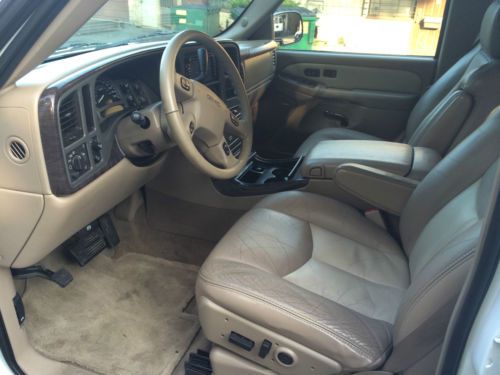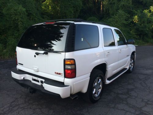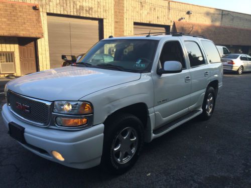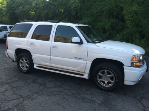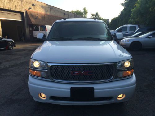 2004 GMC YUKON DENALI SHOWING 177000 MILES, 6.0 V8 ENGINE,AWD,BEAUTIFUL CONDITION SUV, PENNSYLVANIA INSPECTED,RUNS AND DRIVES 110%, TIRES SHOWING ABOUT 75% THREAD, COLD AC HOT HEAT , POWER SEATS, 3ROW SEAT TV DVD THAT WORKS NAVAGATION , 4 PAIRS OF HEADPHONES,2REMOTES. SUNROOF, MEMORY SEATS, FRONT AND REAR HEATED SEATS, WITH NO CHECK ENGINE LIGHTS OR ANYLIGHTS ON THE DASH HAS A DENT ON RIGHT FENDER LOOK AT PICS PLEASE OVERALL IS 9 OUT OF 10. SMOOTHLY SHIFTING TRANSSMISSON.HAS A 6 DISC CD CHANGER, LEATHER INTERIOR IS OVERALL IN GOOD CONDITION SHOWS NO WEAR OR TEAR RIPS OR BURNS,WITH A TOW PACKAGE. TWO TONE LEATHER . ACCIDENT FREE , NON SMOKER