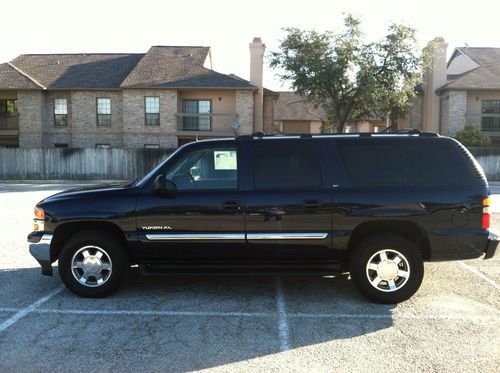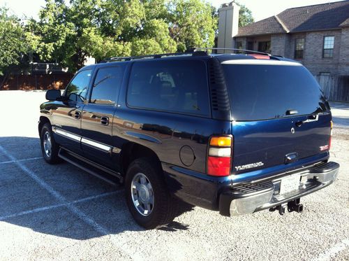 Selling my beautiful 2005 GMC Yukon XL dark blue SLT package with gray leather seats four wheel drive loaded heated seats rear entertainment system towing hitch fog lights fixed running boards rear bucket seats luggage rack Bose stereo system 6 cd in dash player xm radio membership included OnStar captain chairs well maintain full synthetic oil super cold ac front and rear dual front heated seats dual climate control excellent condition tires with plenty of thread car fax 1 owner no accidents Texas title in hand must see drives amazing everything works like it should truly enjoy family vacations great for long trips price is negotiable send me an offer I have all paperwork remote control for the dvd and two wireless headphones spare tire is new never use call me text me email me for more information 210-788-3132 James retails for $13k im asking trade in value ready for a new one I added a picture of car fax and nada book value if you have any questions feel free to contact me at anytime.