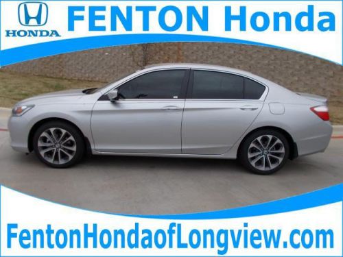 This 2014 Honda Accord Sedan Sport is offered exclusively by Honda of Longview When it comes to high fuel economy, plenty of versatility and a great looks, this Accord Sedan Sport cannot be beat. This Accord Sedan's superior fuel-efficiency is proof that not all vehicles are created equal. There are many vehicles on the market but if you are looking for a vehicle that will perform as good as it looks then this Accord Sedan Sport is the one! The quintessential Honda -- This Accord Sedan Sport speaks volumes about its owner, about uncompromising individuality, a passion for driving and standards far above the ordinary. More information about the 2014 Honda Accord Sedan: The Honda Accord is a mid-sized car, competing against some of the best-selling vehicles in America. Prime targets for the Accord include the Camry and the Altima. The Accord is a solid value, but with a capable and sophisticated chassis that can feel quite luxurious when properly optioned. This versatility allows it to be either a spacious alternative to many economy cars or a less expensive alternative to many luxury cars. There is even a stylish coupe available with performance that matches many sports cars. Interesting features of this model are Fuel efficiency, interior space, long history of reliability, and variety of configurations available Thank you for visiting a listing of Fenton Honda of Longview, home of the FREE OIL CHANGES FOR LIFE! Most of our vehicles have 0.9% financing right now, lock in your low interest rate and go to http://www.fentonhondaoflongview.com/web/financing/ Please call and ask for Mike Buenaventura to receive EXCLUSIVE Internet pricing!!