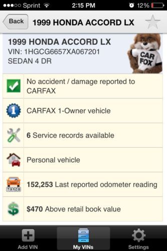 On Nov-10-13 at 09:57:41 PST, seller added the following information: THE LEGENDARY 1999 HONDA ACCORD LX SEDAN. 1 OWNER CLEAN CARFAX & AUTO CHECK. CLEAN INSIDE & OUT. WELL MAINTAINED. ICE COLD AC , POWER WINDOWS , CD PLAYER , ANTI THEFT ALARM. ALL ORIGINAL PAINT , YOU WONT FIND THIS CAR & YEAR & MODEL IN THIS CONDITION. ALL HIGHWAY MILES, THE ORIGINAL OWNER WAS A DELIVERY PHARMACEUTICAL REP. NO RESERVE GET THIS CAR CHEAP. COMES WITH 2 KEYS & 1 REMOTE. |