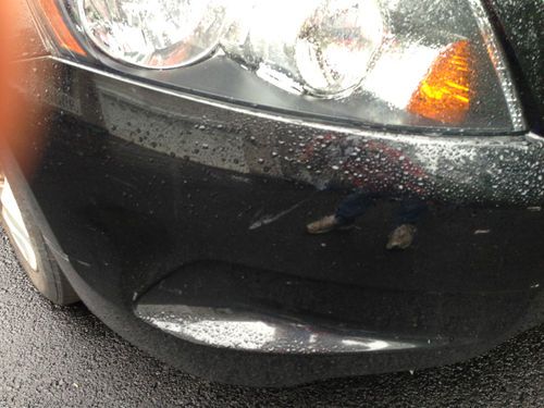 There is a rubber "slap" spot on the passengers side front bumper that could probably be polished out. The chrome on the front is bubbled in one small area but intact.