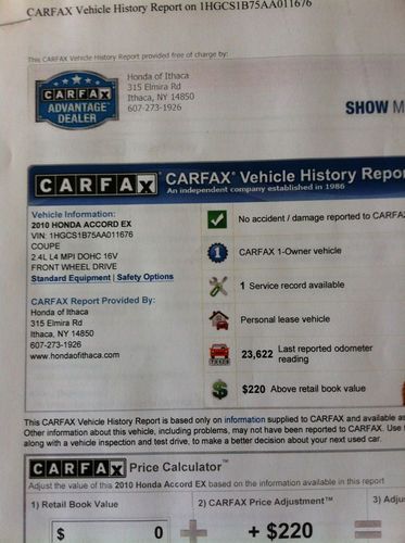 2010 ACCORD-EX COUPE W/ ONLY 26,210 MILES** 1-OWNER** CLEAN CARFAX** EXCELLENT CONDITION ** BAL. OF HONDA WARR.** AUTO.** SUNROOF** POWER WINDOWS & LOCKS, $$ was $17,995** now = **$16,995.00 *** NY STATE INSP. & WARR. INC. TEXT OR LV. MSG. 607-343-5711