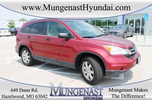 CR-V SE, 4D Sport Utility, 2.4L I4 16V DOHC i-VTEC, 5-Speed Automatic, AWD, Tango Red Pearl, and Cloth. Hurry in! STOP! Read this! How appealing is this wonderful-looking 2011 Honda CR-V? Designated by Consumer Guide as a Compact Car Best Buy in 2011. This Honda CR-V has a great cockpit layout, with all the controls easy to find and right where you need them. Experience the Mungenast Difference! We carry a wide selection of over 600+ available pre-owned vehicles through Mungenast.com! Each of our vehicles is Missouri State Safety and Emissions Inspected! We are a customer-focused, volume dealer eager to earn your business! Rated Hyundai Dealer of the Year (2012 & 2013) in State of Missouri by DealerRater, Mungenast Makes the Difference. Come Experience the Mungenast Difference at Mungenast Hyundai. St Louis' Low Price Volume Hyundai Dealership. View the Used Car Prices at MungenastHyundai.com At 270 and N. Lindberg on Dunn Rd in Hazelwood, MO. Remember Hyundai Makes the Car, Mungenast Makes the Difference! 855-272-4979