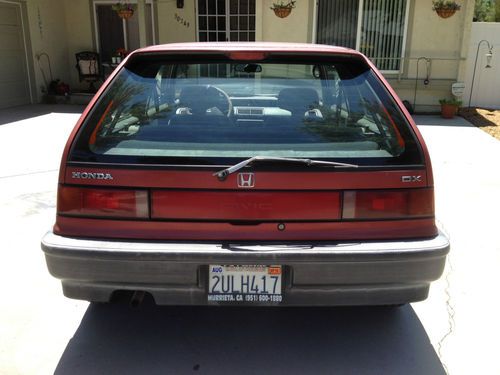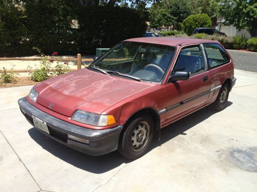 Here is a nice running old Civic Hatchback. It has been sitting for a couple of years as a spare vehicle and driven occasionally. The engine had an upper end (head) job at around 150k, but everything else is original, even the clutch. It starts and runs flawlessly, tires are at 95% and all the same, all electrical systems work, no cooling issues, leaks or smoking, no funny sounds etc. It could use a muffler as there is a rattling sound in the muffler and the tailpipe weld is failing. This will pass California smog, and a cerificate will be issues if it is sold in California, which is good for 90 days. The AC is factory, but is the older R12 type and should be retrofitted to R134. The compressor runs when applying power to the pressure switch, but we can't gurantee what happens if it's charged up. The interior is remarkably clean, with a small fabric tear in the drivers upper side, and some small surface damage to the rear of the headliner. The passenger seat, rear seat, luggage cover, dash and door panels are really clean. There is a small indentation type dent in the left front, but this never reached the hood, headlights or door seam, so it's an easy fix. The paint is shot on all the horizonal surfaces due to the clear coat peeling. There is absolutely no rust on the body at all. There is some surface rust on the steel wheels where the paint has peeled, but it's light surface only. It has an aftermarket Pioneer radio (cassete) which does work in AM, FM and cassete mode. This is a two owner car, with the second owner since the early 90's. Please feel free to ask questions and thanks for looking.