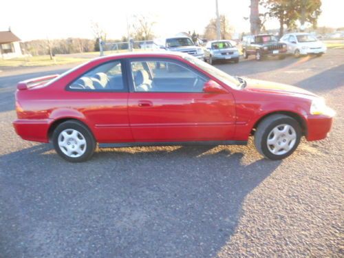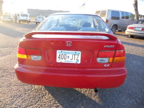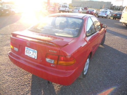 SELLING NO RESERVE! (Like all of our Ebay sales!) ....One owner 47000 actual MILES ,Perfect Honda Civic EX Coupe with 5 speed Manual. Never seen snow or salt and its as pretty a Civic Coupe as you will ever find! Factory Manuals and original Window Sticker is in Glove BOX! Shiny top and bottom with a pristine interior and engine compartment. Garaged and Rust free and one of the lowest mileage Civic EX coupes in the USA! NO EXCUSES HERE! Call Woody with any Questions; 651 303 7769