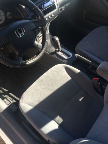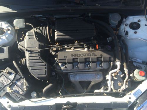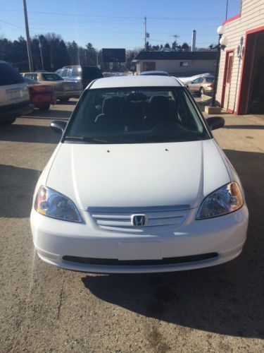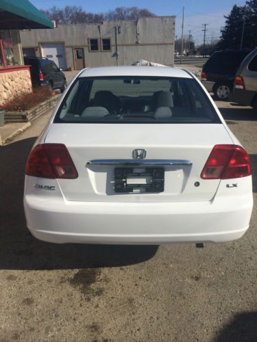 UP FOR BID IS A 2002 HONDA CIVIC LX 4-DOOR SEDAN, IT IS WHITE WITH GRAY INTERIOR, AUTOMATIC TRANSMISSION, POWER WINDOWS, POWER DOOR LOCKS, AFTERMARKET CD PLAYER. IT HAS BRAND NEW TIRES AS PICTURED. LOW LOW LOW MILES ONLY 64,951. COUPLE DOOR DINGS, AND HOOD PAINT CHIPS. RUNS AND DRIVES GREAT. CARPETS AND SEATS LOOK UNUSED. ANY QUESTIONS FEEL FREE TO ASK PRIOR TO BIDDING. NO EXISTING WARRANTY ON THIS VEHICLE. ALL SALES ARE AS IS.