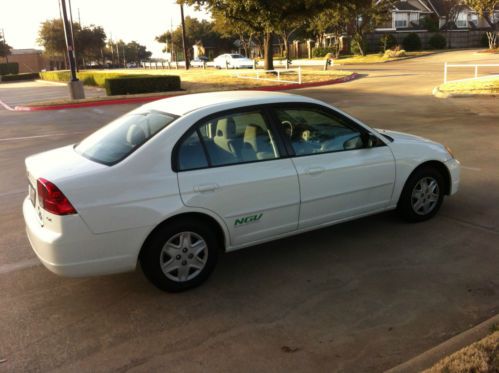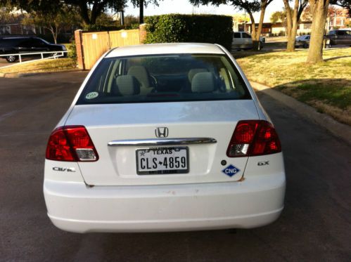 Getting sick and tired of the up and down ridiculous gas prices?? With the price of gas skyrocketing yet again, there's no better time to buy an alternative fuel vehicle. Here is your chance to own a hard to find 2003 Honda Civic GX CNG (Compressed Natural Gas) sedan. Save big $$$ with natural gas, while helping clean up the environment. This is a factory CNG package, NOT an aftermarket retrofit. Dedicated CNG system, NOT bifuel. This was an expensive factory option. Does NOT run on gasoline, only CNG. I have been dealing in CNG vehicles for 4+ years. Please feel free to contact me with any questions as I am always happy to assist. 401-225-6740 (Steven) CNG Specs: Compressed Natural Gas Tank Capacity: Approximately 8 US Gallons Gasoline Equivalent(GGE) @3600 psi 70 degrees F (21 degrees C). Average CNG range approx 200-240 miles. Expiration date 04/2015. · This hard to find 2003 Honda Civic GX Compressed Natural Gas (CNG) Sedan. Equipped with the reliable and highly efficient 1.7L VTEC SOHC engine and automatic transmission. This is was a fleet maintained former gov't vehicle. BEWARE of people selling vehicles with untested/unfilled CNG systems. This vehicle has been filled and test driven 500+ miles. This car is super economical to drive with CNG priced under $1.00 a gal in many areas. State tax credit still available (Utah and other states that offer tax credits). What is CNG??? Compressed Natural Gas or CNG, is one of nature's best untapped energy sources. Unlike fossil fuels, it is constantly produced by the earth and can also can be synthesized through chemical processes. The technology has been around for decades but until recently has been kept in the closet by big oil! It is one of the fastest growing alernative fuel sources and unlike biodiesel and ethanol (E85), is a viable replacement for pertroleum. Within the next 10 years 90% of gov't fleets will be CNG and civilian population will follow over the next 20 yrs. Why should I buy a CNG/Bi Fuel Vehicle?