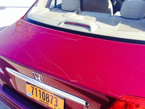PERFECT COMMUTER/FIST CAR/RELIABLE LONG DISTANCE CRUISER. This car is for a buyer that is looking to have something GREAT ON GAS, DEPENDABLE, that WILL NOT RUIN YOUR WALLET without having to care that much about the exterior appearance (anymore).... Pluses: -ONE OWNER vehicle. -SERVICED at Honda service. -CLEAN CARFAX. -RELIABLE -NEW TIRES -Solid drive without strange or suspicious noises. -NO VIBRATIONS, nor unusual rattles. -LOW MILEAGE (less than 8k miles a year) -FUN to drive. -RETAINS its VALUE -CLEAN Interior -NEVER in an accident. -INEXPENSIVE to maintain (or fix... it is Honda though, therefore you can probably ignore the "fix" part) -... you won't cry when scratched for the first time.... :) Minuses: Scratches on the hood, roof, trunk due to previous (original) owner removing snow with inappropriate tools (grrrrrr.) Pictures show all of them. Scratches on the front bumper (both corner- edges) and rear bumper. Couple of quarter-sized dents. Bottom line: Great car with original owner being careless enough to diminish its value by damaging the original paint. You are presented with any opportunity to acquire great product at reduced price due to cosmetic blemishes only. HAPPY BIDDING!!! Feel free to contact me with any additional questions. CARFAX CARFAX Detailed History