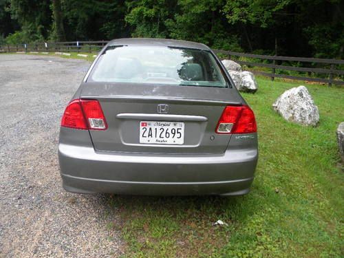 HERE IS AN AWESOME , CLEAN HONDA CIVIC HYBRID. THIS IS ONE OF THE CLEANEST HYBRIDS YOU WILL FIND. THE CHARGING SYSTEM WORKS GREAT. THE TRANSMISSION WORKS AND SHIFTS VERY SMOOTH. THIS CAR STARTS SO QUIET YOU CANNOT HEAR RUNNING. IT IS MARYLAND STATE INSPECTED AND READY TO GO. THERE ARE NO ISSUES WITH THIS CAR. IT HAS AN A/M, F/M 6 DISK CD CHANGER. THE SEATS AND INTERIOR ARE IN EXCELLANT SHAPE WITH NO RIPS OR TARES. TAKE ALOKK AT THE PICTURES AND YOU WILL SEE NO ISSUES. THERE ARE A COUPLE DENTS BUT NOTHING MAJOR.THE PAINT SHOWS REAL WELL. ANY QUESTIONS PLEASE FEEL FREE TO CALL. THERE IS A 200.00 DOCUMENT FEE THAT IS ADDED TO THE WINNING BIDDER. IF YOU ARE OUT OF STATE, WE CAAN ISSUE A 60 DAY TEMPORARY TAG SO THAT YOU CAN DRIVE IT HOME. THE DEPOSIT IS DUE WITHIN 24 HOURS OF CLOSING OF AUCTION. PLEASE CONTACT US WITH ANY AND ALL QUESTIONS.