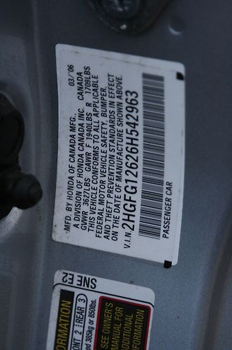 Selling a used 2006 Honda Civic lx 2 door coupe. The mileage represented on this vehicle very day to day because it is my daily driver.The car has 83,045 miles on it right now. This is a garage kept vehicle.There are very mild scratches on this vehicle by the door handle.The engine is mechanically sound and can be driven anywhere with confidence.This vehicle has a smooth shifting transmission.The electronic components on this vehicle are in working order.This vehicle's exterior is clean.The interior is clean and in good condition.The tires are in good shape & just were put on at about 71,000 miles. Have all the documentation as far as service records in the glove box for the vehicle. If you have any questions about this or any of my other auctions please feel free to contact me via message, or you can call or text me at 803-729-6919. Thanks you for your Interest and I look forward to hearing from you. The car does have 20% tint on it as of now, but can be easily have it removed, but however it is up to you. I have a total of three key's two with an alarm, and a valet key that was never used. I have the owners manual and books as well for the car. The car was very well maintained especially for the year. You must arrange for the vehicle to be shipped or picked up at your own cost. A $500 non refundable deposit must be paid via PayPal at the end of the auction. The car is up for sale locally as well, so I do have the right to end the auction at any time. If you have a buy it now price in mind, and don't want to wait until the auction is over you can call, text, or message with a reasonable offer, and I'll get back to asap. The car is being sold as is where is with no returns nor any type of warranty. The car has a clean South Carolina title no accidents, I can show you a copy of the carfax so you don't have to purchase one, but however if you still want to purchase one you are more than welcome to. 3-Point Rear Seat Belts AM/FM Stereo Adjustable Steering Wheel Air conditioning Anti-lock brakes Automatic Transmission Break-Resistant Glass CD player Center Arm Rest Center Console Child-Proof Door Locks Climate Control Clock Cloth Upholstery Compass/Temp. Gauge Coolant Temp. Gauge Courtesy Lights Cruise control Cup Holders Daytime Running Lights Digital Clock Digital Instruments Driver airbag Dual Power Mirrors Energy-Absorbing Panels Engraved VIN Codes Floor Mats Front-Wheel Drive Halogen Headlamps Head Protection System (Airbags) Interior Hood Release Interval Wipers Keyless Entry Leather Steering Wheel Map Light Panic Button Passenger airbag Power Brakes Power Mirrors Power Steering Power locks Power windows Radial tires Rear Defroster Rear Spoiler Reclining Bucket Seats Security System Side airbags Steering Wheel Controls Third Brake Light Tilt Steering Column 3-Point Rear Seat Belts AM/FM Stereo Adjustable Steering Wheel Air conditioning Anti-lock brakes Automatic Transmission Break-Resistant Glass CD player Center Arm Rest Center Console Child-Proof Door Locks Climate Control Clock Cloth Upholstery Compass/Temp. Gauge Coolant Temp. Gauge Courtesy Lights Cruise control Cup Holders Daytime Running Lights Digital Clock Digital Instruments Driver airbag Dual Power Mirrors Energy-Absorbing Panels Engraved VIN Codes Floor Mats Front-Wheel Drive Halogen Headlamps Head Protection System (Airbags) Interior Hood Release Interval Wipers Keyless Entry Leather Steering Wheel Map Light Panic Button Passenger airbag Power Brakes Power Mirrors Power Steering Power locks Power windows Radial tires Rear Defroster Rear Spoiler Reclining Bucket Seats Security System Side airbags Steering Wheel Controls Third Brake Light Tilt Steering ColumnFeatures & Options