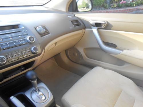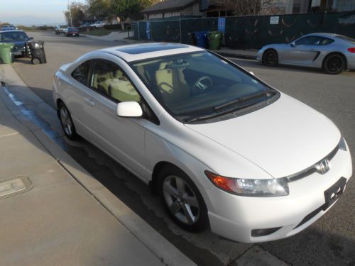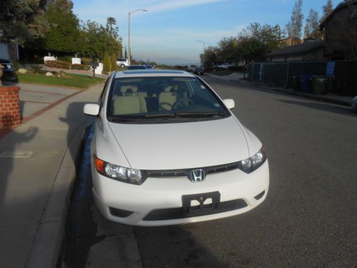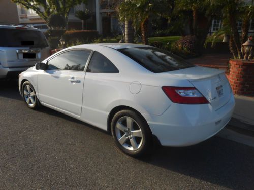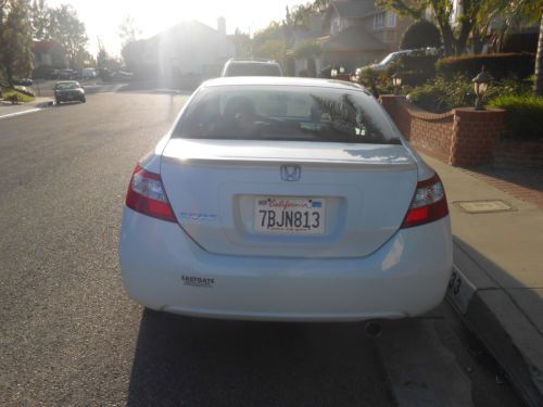 The vehicle for sale is a 2007 Honda Civic EX Coupe. The car is in good condition. The mileage on the vehicle is 66,525 miles. The vehicle exterior is white, while the interior is tan with cloth seat upholstery seats. The exterior of the vehicle has a couple of very small scratches. There is a small, hardly noticeable impression above the rear passenger side tire (please refer to the pictures). The tires were replaced a couple months ago, however they are brand new because the car has not been driven since they were replaced. The wiper blades were also recently replaced and are in great shape. The interior is in fantastic shape. The seats feature no stains nor any wear and tear. The carpets are also in great shape. The audio systems works great, featuring a CD/MP3 player, programmable satellite radio and AUX jack for iPod/iPhone connection ability. The steering wheel features control over the audio system as well as cruise control. The dashboard features digital display of the vehicle's speed. The interior also features power windows and power control of the side mirrors of the vehicle. The trunk is also in fantastic shape as it is very spacious and features the ability to fold down the rear seats to expand the size. Other notes about the vehicle include the fact that there is only one electronic key. I purchased the vehicle as a used vehicle from a dealer in Indianapolis, IN in 2011 and it has not given me a single problem since it was purchased. The Carfax report is available upon request. If interested in discussing the vehicle, please reach out to me via phone at (818) 489-1830 (text or call). If the vehicle is to be purchased, cashier's check is the acceptable form of payment. Thank you for your interest in the vehicle.