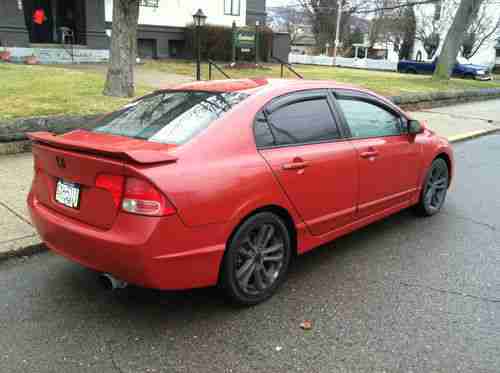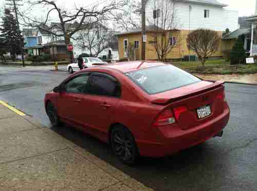 Up for sale is a 2007 Honda Civic Si Sedan 4 door. It has a 2.0 v tech engine with 6 speed manuel transmission. It currently has 92000 miles and the transmission is a honda rebuild with bout 35000 miles. This car runs and drives good. It does have a cel light on due to a small hole in the flex pipe which is causing an oxygen sensor code. It also needs the fuse for the factory amp replaced beacuse the radio turns on but there is no sound. This car was origanally blue but the previous owner had it painted red. The door jams were also painted but the engine bay is still blue. I would give the paint job a 6 out of 10 with 10 being factory. There are a couple small chips in the paint nd the roof could use wet sanded a little. It was not a 100% paint job but it looks ok from 5 feet. . If you need to know anything else please email me and I will return your answers. Thanks and happy bidding... I have a clean and clear title in hand ready to deal. If you are interested in buying it now you cn give me an offer and ill set buy it now price and you can buy it now. Let me know. I need the money for my new place.