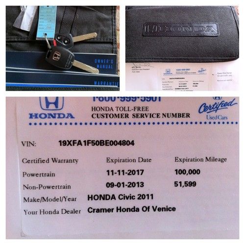 This car has NO ACCIDENTS (see all VIN labels pictured). Nice and clean condition. Great MPG on road. Low miles and automatic. Honda certified this car and was previously purchased with an extended certified warranty: Powertrain 11/11/17 or 100,000 miles and Non-Powertrain 9/01/13 or 51,599. New 4 Bridgestone Turanza Tires. Don't miss this opportunity. I accept best offers but no low balls please.Need more pics or more info? Feel free to call Ric at 727-365-9317. I will be more than happy to assist you with pre-sale or post sale inspections. I can ship the car anywhere in Florida, (shipping cost will apply). I can assist with the shipping arrangements outside Florida.