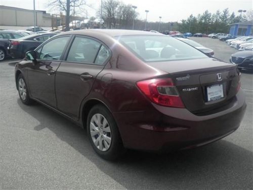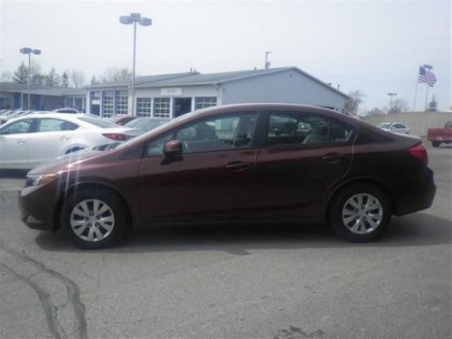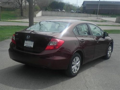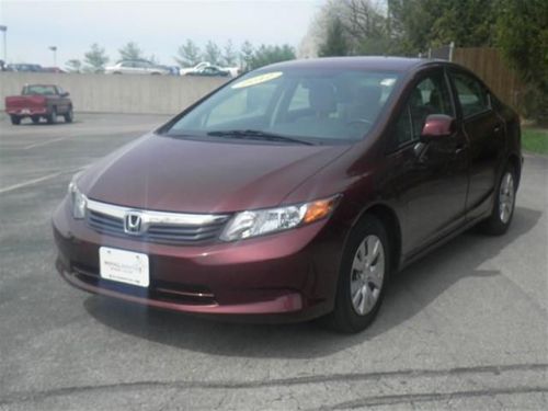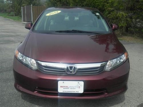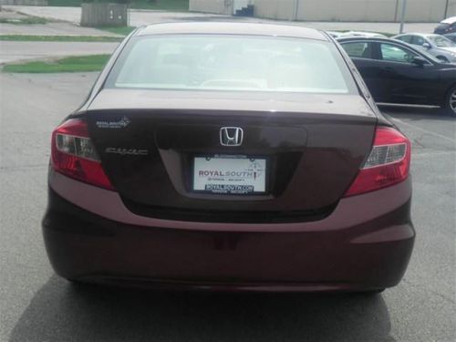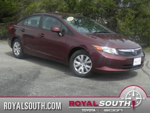 ROYAL CPO w/ WARRANTY~~~~HUGE MPG! This vehicle is being sold as a ROYAL CPO VEHICLE, meaning it has been inspected by our factory-trained technicians, PASSED, and now comes with a WARRANTY included in this price. The warranty is valid at any new car dealership (Toyota or otherwise), as well as any ASE Certified Repair Center. That means you can buy with confidence! Right car! Right price!!! CARFAX 1 owner and buyback guarantee.. Priced below NADA Retail!!! Why pay more for less!!! This trusty 2012 Honda Civic LX would look so much better out doing all the stuff you need it to, instead of sitting here unutilized on our lot... Gassss saverrrr!!! 39 MPG Hwy. Safety Features Include: ABS, Traction control, Curtain airbags, Passenger Airbag, Daytime running lights, Stability control...FEATURES INCLUDE: Power locks, Power windows, Auto, Air conditioning, Cruise control, Audio controls on steering wheel, Tilt and telescopic steering wheel, Multi-function remote - Trunk/hatch/door, Power mirrors, 1.8 liter inline 4 cylinder SOHC engine, 140 hp horsepower, 4 Doors, FWD, Fuel economy EPA highway (mpg): 39 and EPA city (mpg): 28, Tachometer, Trip computer, Interior air filtration, Clock - In-dash... Most of our Used Vehicles come with a 3 month / 3,000 mile warranty, FREE of charge!! All purchases give you FREE CAR WASHES every Saturday for the life of the vehicle! Thank you for considering Royal South. Disclaimer: All prices listed are believed to be accurate; we don't warrant or guarentee listed price.