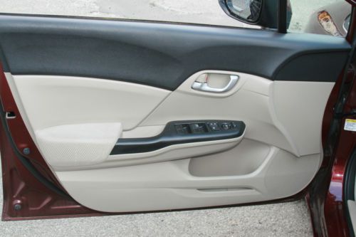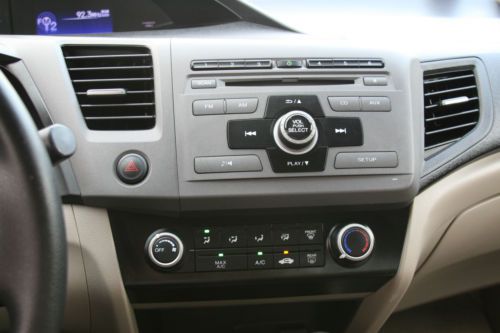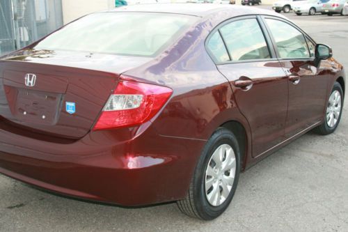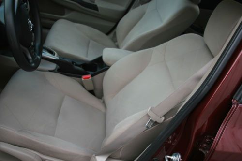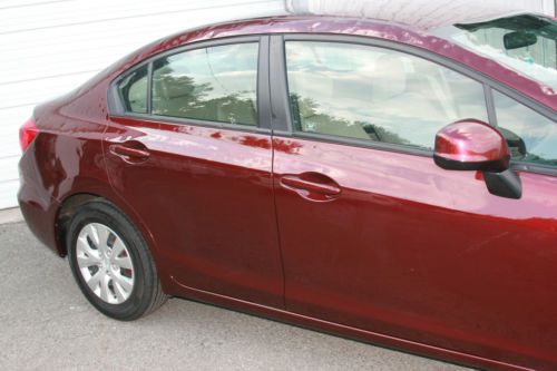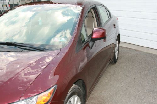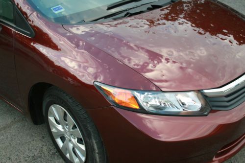 Your are bidding a 2012 Honda Civic LX with a very low milage ( 12920) , we just purchased from an insurance company with a hail damage. You can see in the photos that this Civic needs only taillight. the side mirror glass and windshield, and cosmetic repair all around. Please look all the pictures. The motor runs great, the car drives perfectly. Very low milage ( 12.920) !! How you can see the pictures, the interior is very clean, mint condition. The exterior has hail damage on the top surfaces , the sides is very lightly dinged. Very simple repair, great car for years. With this purchase you can save BIG!!! Car with this miles, sales for almost double price. If you a local and you would like to see the car, please email me. Car is located in Clifton , New Jersey. 25 min from New York City. If you are the winning buyer, we can delivery the car in 50mile radius. FeaturesInterior FeaturesFront Seats