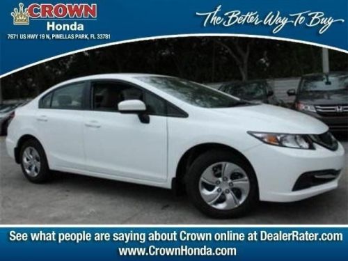 , Before Discount:$19,980.00, Dealer Discount:($2,349.00), Internet Price:$17,631.00, Total Savings:($2,349.00)!BACK-UP CAMERA, BLUETOOTH, MP3 Player, KEYLESS ENTRY, 39 MPG, Redesigned for 2014 the Honda Civic is back to rest the critics of the past. Whichever Civic you choose, you'll find the technology and refinement to make the journey more exciting than the destination. A new front grille and headlights adorn the front end, while new taillights help you stand out from behind. Add to that its wheel options and you've got the sleekest Civic yet. The 1.8L, single overhead camshaft, aluminum-alloy i-VTEC 4-cylinder engine uses state of the art engineering technology to produce an impressive 143hp, yet it still receives excellent fuel-efficiency ratings and a Partial Zero-Emission Vehicle rating, all on regular gasoline. Honda???s new Earth Dreams continuously variable transmission (CVT) provides an outstanding driving experience. The CVT allows the engine to always operate at the most efficient rpm level, enabling maximum efficiency under all driving conditions. Interior features include an impressive array of available tech features including an available 7-inch display audio with a touch-screen interface; the Honda LaneWatch system which activates a tiny camera on the passenger side mirror when you signal to change lanes to cover more view than the passenger-side mirror; HondaLink's Aha app allows you to access news, social media, restaurant searches, internet radio, and more; a rearview camera is available with up to 3 available angles to view; Satellite navigation is also available with voice recognition software. The Civic's Advanced Compatibility Engineering II body structure is a Honda-exclusive body design that enhances occupant protection and crash compatibility in frontal collisions. The ACE design utilizes a network of connected structural elements to distribute crash energy more evenly throughout the front of the vehicle. This enhanced frontal crash-energy management helps to reduce the forces transferred to the passenger compartment and can help to more evenly disperse the forces transferred to other vehicles in a crash. Crown Automotive Group serving Tampa Bay Florida offers great low prices, rebates and incentives for new Group & used Group cars, vans and SUVs to all of our neighbors in St. Petersburg, Largo, Clearwater, and Pinellas Park. Our Expert Service & Parts staff assist our Florida customers keep their Group vehicles in great shape.