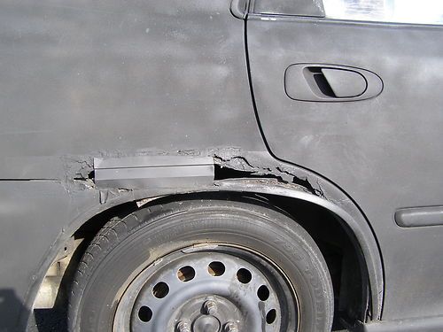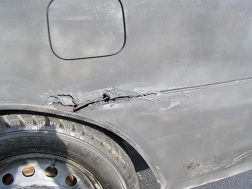 *Dents on the front hood and lots of corrosion on both sides of the car.