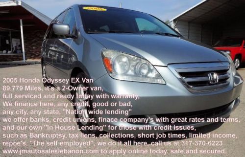 This 2005 Honda Oddysey EX van has only 89,779, really low miles, and its a 2-Owner van, fully serviced and ready today. Clean Carfax history report shows no accidents ever. 3rd row seating, rear heat and air, all power, alloys, new tires and brakes, this one is truly a winner. We even add another feature, how about a Zero deductible warranty good anywhere you live, you take it to your mechanic for repairs should something come up, and that covered repair will cost you nothing out of pocket, plus you'll also get towing allowance, rental car and roadside assistance with this warranty, we want you to feel protected. We service each and every one of our vehicles before you buy them, your assured of quality here. We accept any and all trades, just drive them in. We accept cash, cashiers checks, money orders, bank drafts and wires, any major credit card or simply finance this with one of our over 35 lenders that we offer at competitive rates and terms, such as banks, credit unions, finance company's and our own in house lending for those with limited, no credit, slow credit, credit issue's such as tax liens, medical collections, collections in general, divorce, repossessions, bankruptcy chapter 7 or 13's are done here, limited income, social security income, cash jobs such as waitress, the self employed, we do it all here, just call us today to see just how easy we make it to get the vehicle of your dreams, call us today or apply online, its safe and secured. The phone number and website are on most every picture of this ad, call us today and drive. Visit our website at www.jmautosaleslebanon.com for more pictures or give us a call at 877-730-3227, ask for Jerry! Why Buy from us! Our dealership, has a smaller more personal, very honest, family way of doing business. We can offer you a better value for the dollar because of our low overhead, so you get more vehicle for less money at J&M Auto Sales Inc of Lebanon. All our vehicles go thru an inspection proces *IMPORTANT NOTICES* SEE VIDEOS OF OUR VEHILCES AT www.jmautosaleslebanon.com FREE 6 MONTH OR 6,000 Mile Warranty. Vehicles pass a 75 point inspection before offered for sale. All Vehicles are certified and come with a free warranty and free carfax history report. Prices do not include doc fee, registration, or state sales tax. We have financing, banks, credit unions, ect, for almost anyone!