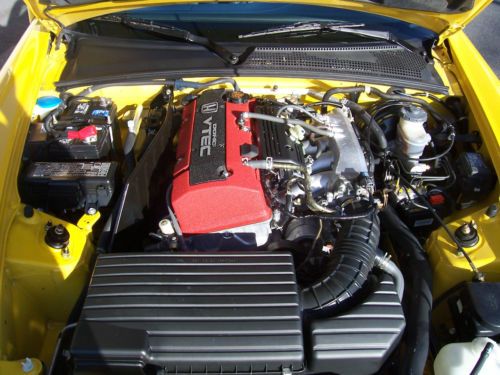 It's all about that little red button. Located on the left side of the driver's console and labeled engine start, the button reflects the racing heritage found on the S2000 roadster. The centerpiece is a 2.0-liter DOHC four-cylinder engine. It is equipped with an updated version of Honda's VTEC system, which can alter both valve timing and valve lift. The VTEC system allows the engine to produce maximum power while still being tractable enough for urban driving. If you need proof of Honda's technological prowess, look no further than the specifications: 240 horsepower at 8,300 rpm and 153 foot-pounds of torque at 7,500 rpm. Twist the key, hit the red start button, and the engine will give you the highest specific output (120 horsepower per liter) of any normally aspirated mass-production engine in the world. It will also spin to speeds that most other engines would choke on -- redline is 9,000 rpm. If this still isn't impressive enough, This Honda still meets meet low-emission vehicle status. This S2000 Currently has only 36,693 Original Miles and is in immaculate shape. No dents, dings, or scratches. The Rio Yellow Pearl Paint shows beautiful in the sun unlike any other color and is truly beautiful and pristene as it should be with only 36k miles. Everything feels tight, and quiet on the car. No rattles or squeeks. Front tires are about 50% and Rears are about 30%. This Car is only a 2 Owner car and both owners have babied the car since new. Handling, Lets talk about handling, This car handles unlike anything you've ever driven. I Have personally owned 3 late model corvettes and was thouroughly impressed with how this handled. It feels like you are on roller coaster rails. There is only one version of the S2000, so all cars get 16-inch wheels and high-intensity discharge headlights as standard equipment. For occupant safety, Honda has designed the car to absorb as much crash energy as possible. It also has installed seatbelts with load limiters and pre-tensioners, driver and passenger airbags and roll bars. Inside, the S2000 comes with air conditioning, a digital instrument panel, a CD audio system and leather seats. |
