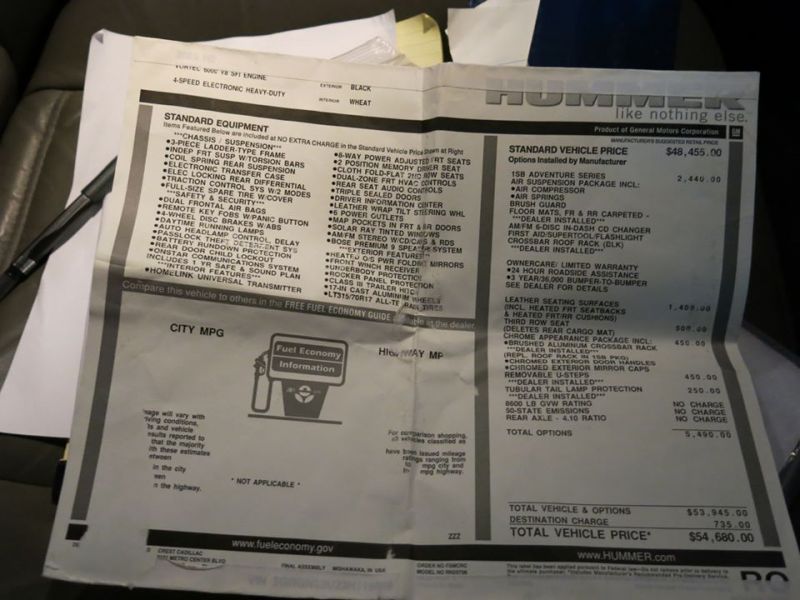 2003 Hummer H2 Adventure Series SUV (VIN: 5GRGN23U23H115889), black / wheat leather and black carpeting, 72,400 original miles, 4-spd. auto trans., Vortec 6.0-liter V8, full-time 4WD, traction control, locking rear differential, 2-speed transfer case, dual front airbags, 4-wheel disc brakes w/ ABS, rear limited slip differential, ladder-type frame with full-length box section side rails, Options: 1SB Adventure package @ $2,440.00 (air suspension incl. compressor and springs), front brush guard, Hummer branded carpeted floor mats, BOSE sound with in-dash AM/FM/6CD with sat radio, 2-stage Heated front and rear seats, Hummer branded first aid / toolkit / flashlight and hat, leather interior incl. 2-stage heated front and rear seats @ $1,400.00, power front seats with 2-position memory, 3rd row seat @ $500.00, Chrome appearance package incl. door handles and ext. mirror caps, gas filler cap and roof crossbars, Removable square U-steps @ $450.00, tubular tail lamp guards @ $250.00, Interior mounted spare tire, Trailering package incl. Warn quick connect power cable plugs front and rear, 17” chrome rims with BF Goodrich All-Terrain T/A Baja Champion tires, recent service incl. trans fluid, water pump and thermostat, 8,600 GVWR, 6,400 lb. curb weight, 6,700 lb. towing capacity, 32 gallon fuel capacity, book & manuals & window sticker, 3 keys and 3 remotes. All services and recalls performed, clean CarFax showing no accidents, 3-owners since new, never smoked in, extremely nice condition inside and out and drives great - was just taken on a trip to Chicago. New MSRP of $54.680.00. Offered for quick sale at $18,500.00 / best offer. Call or text Brian @ (812) 760-5513 ~ Evansville, IN 47715.