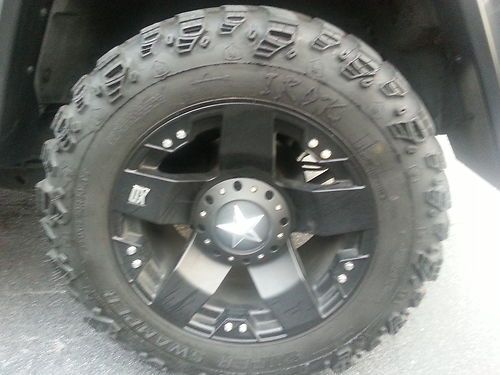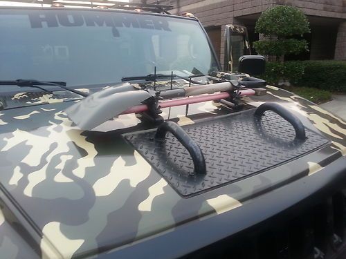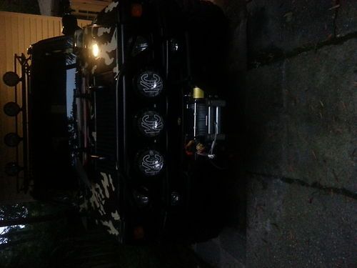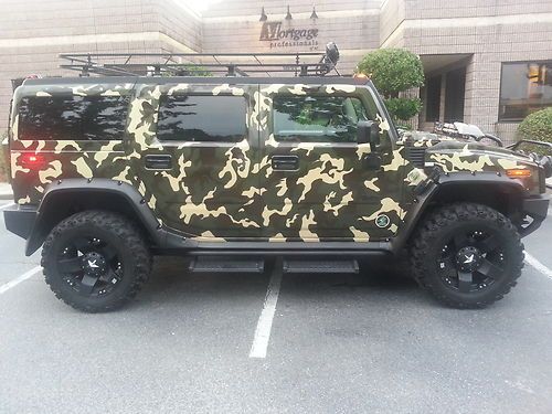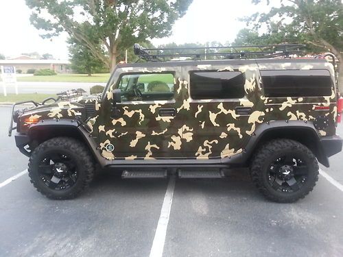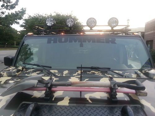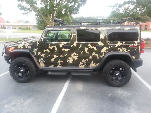 Options: Irok Super Swamper Tires with Rock Star Wheels, Tuff Stuff Winch, New Pioneer Radio with Remote Control, Double Running Boards on Each Side, Roof Rack with Back Ladder and KC Spot Lights, Front Guard with KC Lights, Mounted Shovel, Axe on Hood, Gas & Water Can Mounted on Back with Jack, Custom Camouflage Paint, 4-Wheel Drive, Leather Seats, CD Player