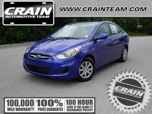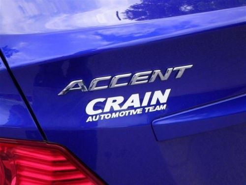 This 2012 Hyundai Accent GLS is offered to you for sale by Crain Hyundai of Bentonville. 888-292-2234 The Hyundai Accent GLS is economically and environmentally smart. Hyundai clearly delivers on its promise to provide a fuel-efficient vehicle that has the great qualities you need in a vehicle. The mileage on this Accent GLS is reflective of it's age and you can tell. The previous owner took great care of this vehicle so that you'll be able to enjoy the benefits of a well cared for vehicle offered to you by Crain Hyundai of Bentonville. Hyundai's Accent may be best known as the cheapest car in America, but for 2012, the automaker has decided to step away from that pursuit with its entry-level compact. The Accent offers quite a bit of bang for the buck in a compact car, and its new 1.6L engine is both relatively powerful and very efficient. At right around $13k, the Accent is a great value, with more options than what you'd get on a comparably priced Ford Fiesta, Honda Fit, Toyota Yaris or MAZDA2. This model sets itself apart with Fresh styling, efficient new 1.6L engine, excellent bang for the buck Every new and pre-owned vehicle is backed by the Crain Commitment, including our 100% low price guarantee, a 100 hour love it or leave it exchange policy, and a 100 year 100,000 mile warranty. The Crain Team's Got 'Em! Give us a call at Crain Hyundai of Bentonville 888-292-2234. Combined Crain Hyundai's sales department has over 100 years of experience and dedication in taking care of our customers before and after the sale. We'll do our best to get you into the vehicle you have always wanted, and we strive to make buying or leasing a new vehicle a pleasant and rewarding experience.... That new Hyundai is waiting for you!