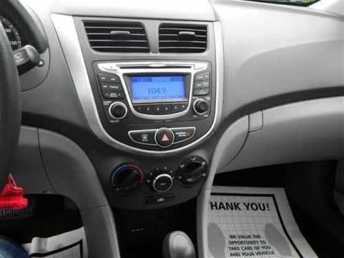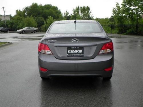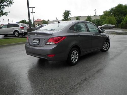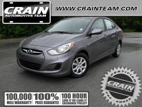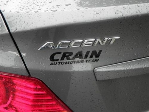 This 2013 Hyundai Accent GLS is offered exclusively by Crain Hyundai of Bentonville 888-292-2234 If you are looking for a vehicle with great styling, options and incredible fuel economy, look no further than this quality automobile. Crain Hyundai of Bentonville wants you to drive off the lot with the confidence of knowing that your newly purchased Accent GLS is still covered under the Hyundai factory warranty. This peace of mind will be truly irreplaceable when purchasing a lightly-used vehicle. More information about the 2013 Hyundai Accent: A sister vehicle to the Kia Rio, the Hyundai Accent is a subcompact available as either a sedan or a hatchback. Well-equipped in standard form, the Accent has an impressive 92.2 total cubic feet of passenger room, defying the myth of small cars' cramped cabins. Fuel economy is also impressive, averaging 28 mpg in the city and 37 mpg on the highway, thanks in part to special low rolling resistance tires. Strengths of this model include available as a hatchback or sedan, hybrid-like mileage, impressive interior passenger room, Affordability, and strong standard feature list Every new and pre-owned vehicle is backed by the Crain Commitment, including our 100% low price guarantee, a 100 hour love it or leave it exchange policy, and a 100 year 100,000 mile warranty. The Crain Team's Got 'Em! Give us a call at Crain Hyundai of Bentonville 888-292-2234. Combined Crain Hyundai's sales department has over 100 years of experience and dedication in taking care of our customers before and after the sale. We'll do our best to get you into the vehicle you have always wanted, and we strive to make buying or leasing a new vehicle a pleasant and rewarding experience.... That new Hyundai is waiting for you!