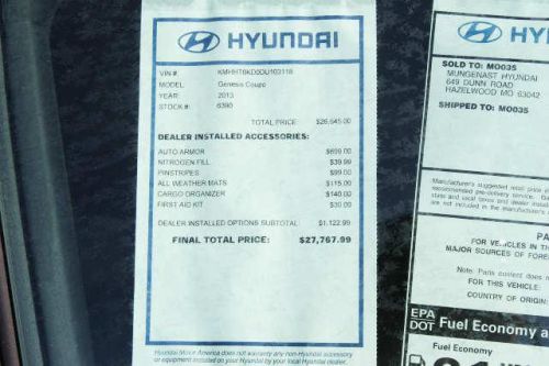 Genesis Coupe 2.0T, 2D Coupe, 2.0L 4-Cylinder DOHC 16V Dual CVVT, 8-Speed Automatic with SHIFTRONIC, RWD, Black Noir Pearl, and Blk Cloth. Turbo! This 2013 Genesis Coupe is for Hyundai fans looking far and wide for that perfect car. It will save you cash at the pumps with its fuel efficient 2L powerplant. Experience the Mungenast Difference! Visit us at mungenasthyundai.com. Mungenast Hyundai in Hazelwood just off of North Lindbergh and I-270 at 649 Dunn Rd, Hazelwood, MO 63042 888-212-1161 St Louis's Low-Priced Volume Hyundai Dealer! Remember, Hyundai makes the car, Mungenast makes the difference!Prices do not include additional fees and costs of closing, including government fees and taxes, any finance charges, any dealer fees, any emissions testing fees or other fees. All prices, specifications and availability subject to change without notice. Contact dealer for most current information. Advertised price includes all available factory and dealership rebates and discounts. See Mungenast Hyundai for complete details. This offer includes all rebates and dealer cash back to the dealer. Includes the $2000 HMF Bonus cash so this offer in not available with 0% financing. Includes Valued Owner Rebate of $500 and Military Rebate of $500. See a Mungenast Sales Associate for complete details and requirements for rebates. All Dealer Installed Accessories are extra. Come Experience the Mungenast Difference at Mungenast Hyundai. St Louis' Low Price Volume Hyundai Dealership. View the new prices at MungenastHyundai.com At 270 and N. Lindberg on Dunn Rd in Hazelwood, MO. Remember Hyundai Makes the Car, Mungenast Makes the Difference! 888-212-1161