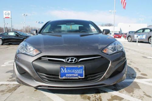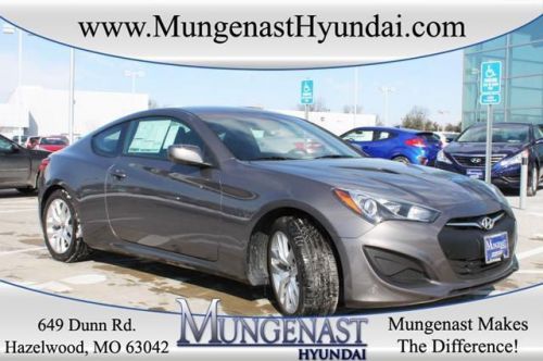 Genesis Coupe 2.0T, 2D Coupe, 2.0L 4-Cylinder DOHC 16V Dual CVVT, 8-Speed Automatic with SHIFTRONIC, RWD, Empire State Gray, and Blk Cloth. Turbo! Come take a look at the deal we have on this wonderful 2013 Hyundai Genesis Coupe. Add up all the hours you spend in your car each year, and you'll certainly appreciate the interior comfort of this Genesis Coupe. Experience the Mungenast Difference! Visit us at mungenasthyundai.com. Mungenast Hyundai in Hazelwood just off of North Lindbergh and I-270 at 649 Dunn Rd, Hazelwood, MO 63042 888-212-1161 St Louis's Low-Priced Volume Hyundai Dealer! Remember, Hyundai makes the car, Mungenast makes the difference!Prices do not include additional fees and costs of closing, including government fees and taxes, any finance charges, any dealer fees, any emissions testing fees or other fees. All prices, specifications and availability subject to change without notice. Contact dealer for most current information. Advertised price includes all available factory and dealership rebates and discounts. See Mungenast Hyundai for complete details. This offer includes all rebates and dealer cash back to the dealer. Includes the $2000 HMF Bonus cash so this offer in not available with 0% financing. Includes Valued Owner Rebate of $500 and Military Rebate of $500. See a Mungenast Sales Associate for complete details and requirements for rebates. All Dealer Installed Accessories are extra. Come Experience the Mungenast Difference at Mungenast Hyundai. St Louis' Low Price Volume Hyundai Dealership. View the new prices at MungenastHyundai.com At 270 and N. Lindberg on Dunn Rd in Hazelwood, MO. Remember Hyundai Makes the Car, Mungenast Makes the Difference! 888-212-1161