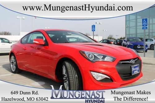 Genesis Coupe 3.8 R-Spec, 2D Coupe, 3.8L V6 DGI DOHC 24V Dual CVVT, 6-Speed Manual, RWD, Tsukuba Red, and Black/Black w/Leather Seating Surfaces. Hyundai has outdone itself with this fantastic 2014 Hyundai Genesis Coupe. It just doesn't get any better at this price! Add up all the hours you spend in your car each year, and you'll certainly appreciate the interior comfort of this Genesis Coupe. Experience the Mungenast Difference! We carry a wide selection of over 600+ available pre-owned vehicles through Mungenast.com! Each of our vehicles is Missouri State Safety and Emissions Inspected! We are a customer-focused, volume dealer eager to earn your business! This offer includes all rebates and dealer cash back to the dealer. Includes the $2000 HMF Bonus cash so this offer in not available with 0% financing. Includes Valued Owner Rebate of $500 and Military Rebate of $500. See a Mungenast Sales Associate for complete details and requirements for rebates. All Dealer Installed Accessories are extra. Come Experience the Mungenast Difference at Mungenast Hyundai. St Louis' Low Price Volume Hyundai Dealership. View the new prices at MungenastHyundai.com At 270 and N. Lindberg on Dunn Rd in Hazelwood, MO. Remember Hyundai Makes the Car, Mungenast Makes the Difference! 888-212-1161