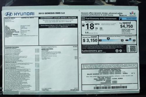 5.0L V8 DGI DOHC, 8-Speed Automatic with SHIFTRONIC, and RWD. No games, just business! Hey! Look right here! Want to stretch your purchasing power? Well take a look at this superb-looking and fun 2015 Hyundai Genesis. This car is the ultimate combination of high performance and luxury. Experience the Mungenast Difference! Visit us at mungenasthyundai.com. Mungenast Hyundai in Hazelwood just off of North Lindbergh and I-270 at 649 Dunn Rd, Hazelwood, MO 63042 888-212-1161 St Louis's Low-Priced Volume Hyundai Dealer! Remember, Hyundai makes the car, Mungenast makes the difference!Prices do not include additional fees and costs of closing, including government fees and taxes, any finance charges, any dealer fees, any emissions testing fees or other fees. All prices, specifications and availability subject to change without notice. Contact dealer for most current information. Advertised price includes all available factory and dealership rebates and discounts. See Mungenast Hyundai for complete details. This offer includes all rebates and dealer cash back to the dealer. Includes the $2000 HMF Bonus cash so this offer in not available with 0% financing. Includes Valued Owner Rebate of $500 and Military Rebate of $500. See a Mungenast Sales Associate for complete details and requirements for rebates. All Dealer Installed Accessories are extra. Come Experience the Mungenast Difference at Mungenast Hyundai. St Louis' Low Price Volume Hyundai Dealership. View the new prices at MungenastHyundai.com At 270 and N. Lindberg on Dunn Rd in Hazelwood, MO. Remember Hyundai Makes the Car, Mungenast Makes the Difference! 888-212-1161