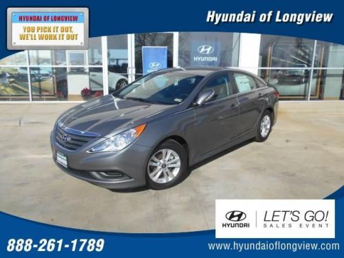 2014 Hyundai Sonata 4dr Sdn 2.4L Auto GLS Hyundai of Longview presents this 2014 Hyundai SONATA 4dr Sdn 2.4L Auto GLS. Represented in GRAY and complimented nicely by its GRAY interior. Under the hood you will find the 4-Cyl PZEV 2.4L coupled with the AUTO 6-SPD SHFTRNC. Warranty Information: Purchase this Hyundai with confidence knowing it is backed with a 60 month / 60000 mile warranty. Options and Safety Features: Nicely equipped with ABS And Driveline Traction Control, Airbag Occupancy Sensor, Blue Link Emergency S.O.S, Curtain 1st And 2nd Row Airbags, Dual Stage Driver And Passenger Front Airbags, Dual Stage Driver And Passenger Seat-Mounted Side Airbags, Electronic Stability Control (ESC), Outboard Front Lap And Shoulder Safety Belts -inc: Rear Center 3 Point, Height Adjusters and Pretensioners, Rear Child Safety Locks, Side Impact Beams, Tire Specific Low Tire Pressure Warning and ABS (4-WHEEL), AIR CONDITIONING, ALLOY WHEELS, AM/FM STEREO, BLUE LINK TELEMATICS, BLUETOOTH WIRELESS, CRUISE CONTROL, DAYTIME RUNNING LIGHTS, DUAL AIR BAGS, ELECTRONIC STABILITY CONTROL, HEAD CURTAIN AIR BAGS, KEYLESS ENTRY, MP3 (SINGLE DISC), POWER DOOR LOCKS, POWER STEERING, POWER WINDOWS, SIDE AIR BAGS, SIRIUSXM SATELLITE, TILT & TELESCOPING WHEEL, TRACTION CONTROL. Hyundai of Longview WE WILL BEAT ANY DEAL! At Hyundai of Longview our goal is to provide you with an excellent vehicle purchase and ownership experience. For the finest in personal customer service, please contact the Internet Department directly through this website. Also, please note, we take great care to keep our listings up to date, however our inventory changes daily and not all inventory is online. If you do not see what you are looking for, then please call. We look forward to providing you with excellent customer service and welcoming you as a Hyundai of Longview client. You can reach us at 888-464-9302 or by visiting us online at www.hyundaioflongview.com. Please call us for more information. "You pick it out and We'll work it out!"