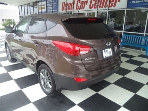 This 2014 Hyundai Tucson 4dr FWD 4dr GLS SUV features a 3.3L V6 FI DOHC 24V 6cyl Gasoline engine. It is equipped with a 6 Speed Automatic transmission. The vehicle is Kona Bronze with a Taupe interior. It is offered with a full factory warranty. - Cruise Control, Tinted Windows, Power Door Locks, Tachometer, Digital Info Center, Tilt Steering Wheel, Steering Wheel Radio Controls, Side Airbags, Keyless Entry, Security System, ABS Brakes, Traction Control, Dynamic Stability, Rear Defogger, Alloy Wheels, Gate Type, Electronic Shift Lock System And Manual Shift Mode, 2.0L DOHC 16V I4 with CVVT MPI, Front-Wheel Drive, Front Bucket Seats -inc: 6-way adjustable driver's seat, 4-Way Passenger Seat -inc: Manual Recline and Fore/Aft Movement, Power Rear Windows and Fixed 3rd Row Windows, Front Cupholder, Rear Cupholder, Remote Releases -Inc: Mechanical Fuel, HVAC -inc: Underseat Ducts, Locking Glove Box, Driver Foot Rest, Interior Trim -inc: Metal-Look Interior Accents, Full Cloth Headliner, Urethane Gear Shift Knob, Full Floor Console with Covered Storage, Front Map Lights, Fade-To-Off Interior Lighting, Full Carpet Floor Covering, Carpet Floor Trim, Cargo Area Concealed Storage, Cargo Space Lights, Driver / Passenger And Rear Door Bins, Power 1st Row Windows with Driver 1-Touch Up/Down, Delayed Accessory Power, Digital/Analog Display, Manual Adjustable Rear Head Restraints, Front Center Armrest and Rear Center Armrest, 3 12V DC Power Outlets, Air Filtration, taupe, Compact Spare Tire Mounted Inside Under Cargo, Clearcoat Paint, Body-Colored Front Bumper, Body-Colored Rear Bumper with Black Rub Strip/Fascia Accent, Black Side Windows Trim and Black Front Windshield Trim, Body-Colored Door Handles, Lip Spoiler, Body-Colored Grille, Liftgate Rear Cargo Access, 3.510 Axle Ratio, GVWR: 4, 54-Amp/Hr 600CCA Maintenance-Free Battery with Run Down Protection, 110 Amp Alternator,4-Way Passenger Seat -inc: Manual Recline and Fore/Aft Movement,Air Filtration,Cargo Area Conceal ... HYUNDAI HAS THE MOST MODERN, ATTRACTIVE, UPDATED LINE-UP FOR 2012. GET MORE CAR FOR YOUR HARD-EARNED DOLLAR FROM HENDRICK HYUNDAI'S INTERNET SALES TEAM!